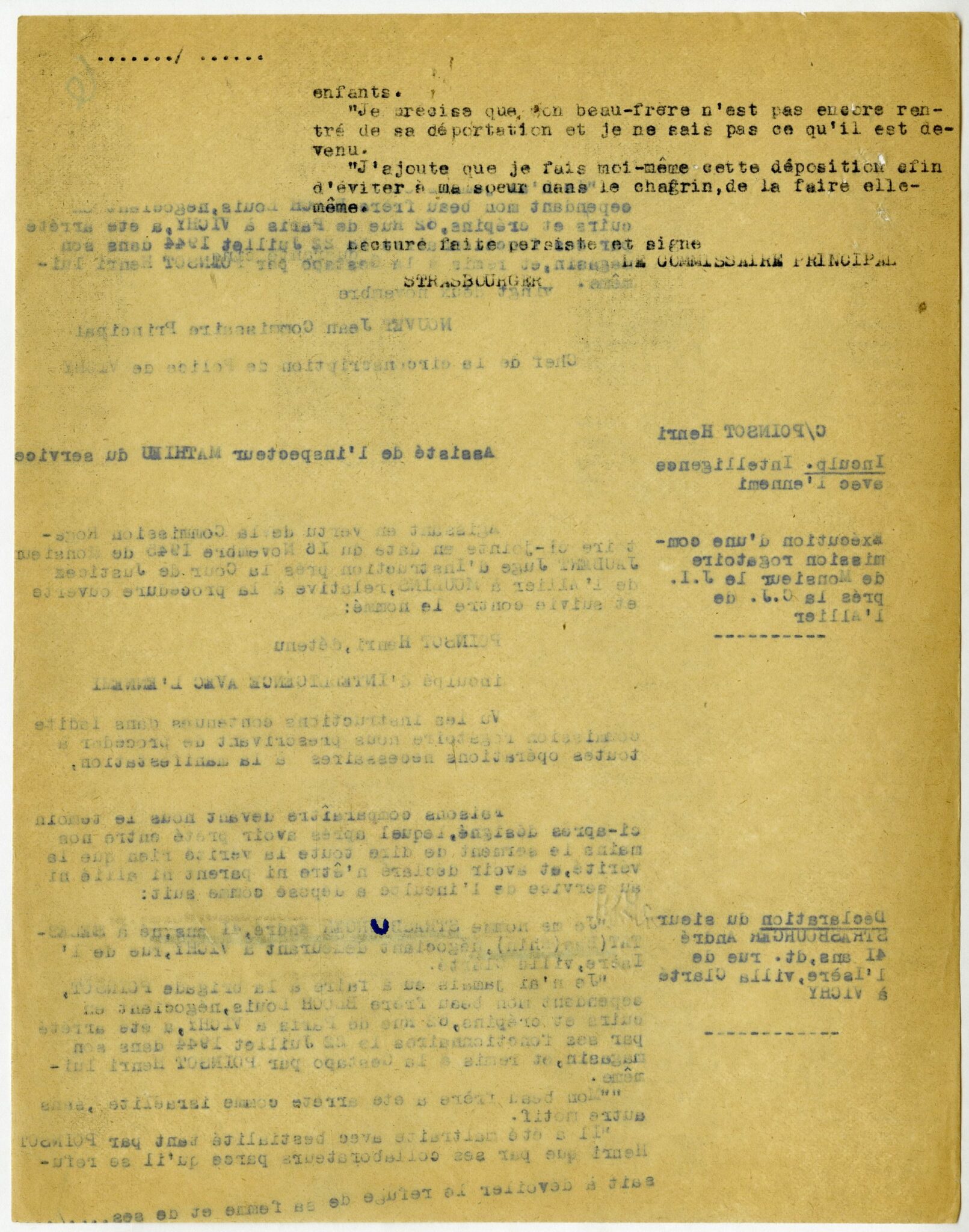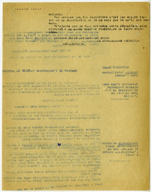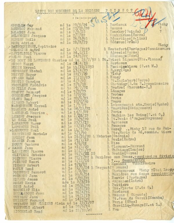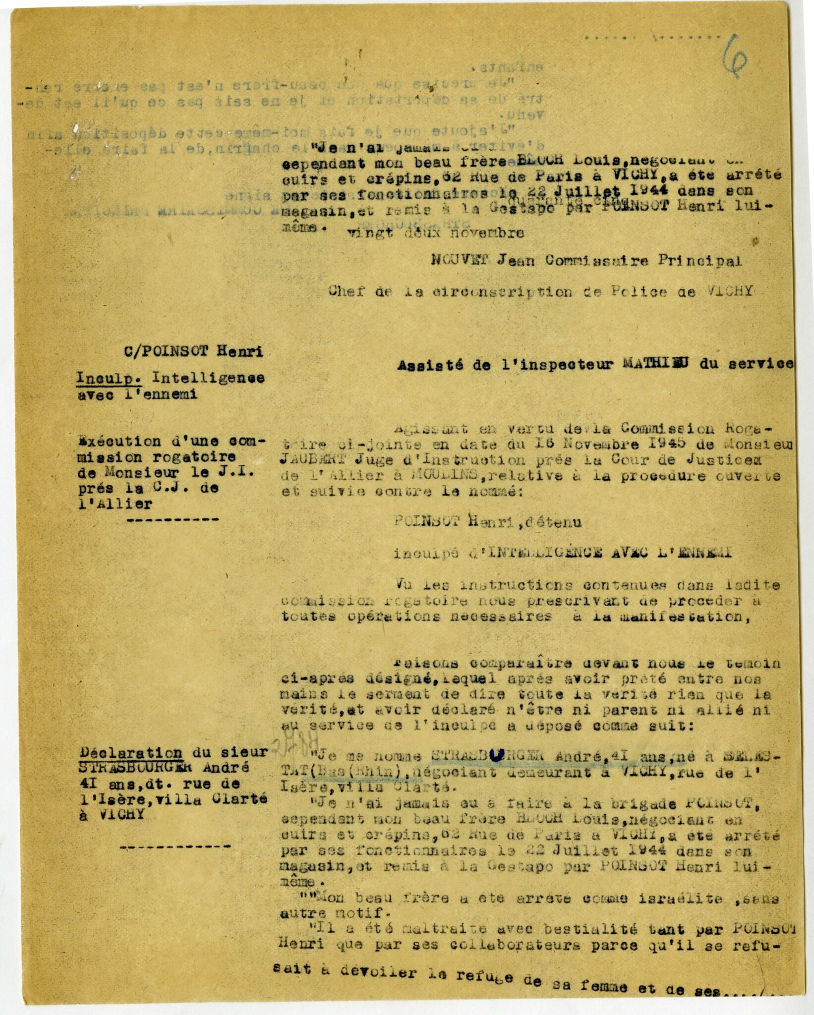 Pour les Juifs à Vichy, les six premiers mois de l’année 1944 — qui correspondent aux derniers mois de l’Occupation — s’avèrent plus meurtriers que toute l’année précédente : près de 80 d’entre eux sont arrêtés et déportés entre janvier et juillet. Les arrestations sont menées conjointement par les autorités allemandes, la milice, et la brigade dirigée par Pierre Poinsot. Ce dernier, après s’être tristement illustré à Bordeaux, est nommé au printemps 1944 à Vichy, en qualité de sous-directeur des Renseignements généraux, placé sous l’autorité du milicien Jean Degans, alors directeur du service.
