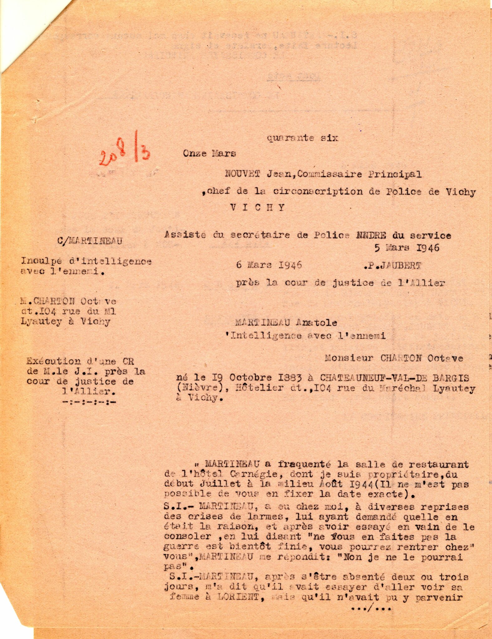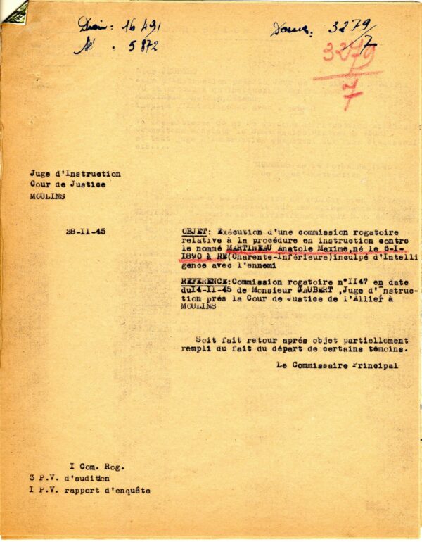 Les membres de la brigade quittent Vichy en août 1944. Leur cavale, toutefois, est de courte durée : la plupart sont arrêtés dans les mois qui suivent leur départ. Leur procès se tient en 1946. Martineau, qui pleure tout au long de l’audience, nie les faits qui lui sont reprochés et prétend n’avoir frappé personne. Il explique avoir été dominé par Pierre Poinsot « qui lui faisait peur ». D’après le médecin qui l’a examiné, Martineau était « un individu amoindri », dû en partie à une méningite cérébro-spinale, contractée quelques années auparavant et au traumatisme lié aux bombardements qu’il avait subis à Lorient. Il conclut à une responsabilité limitée. Martineau est condamné à 10 ans de travaux forcés et à la dégradation nationale à vie.