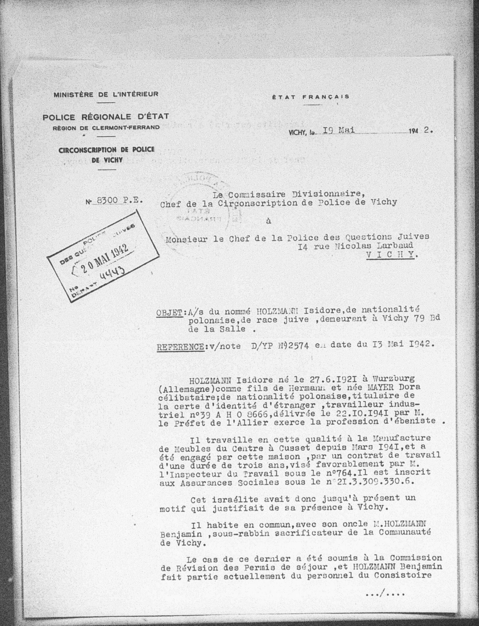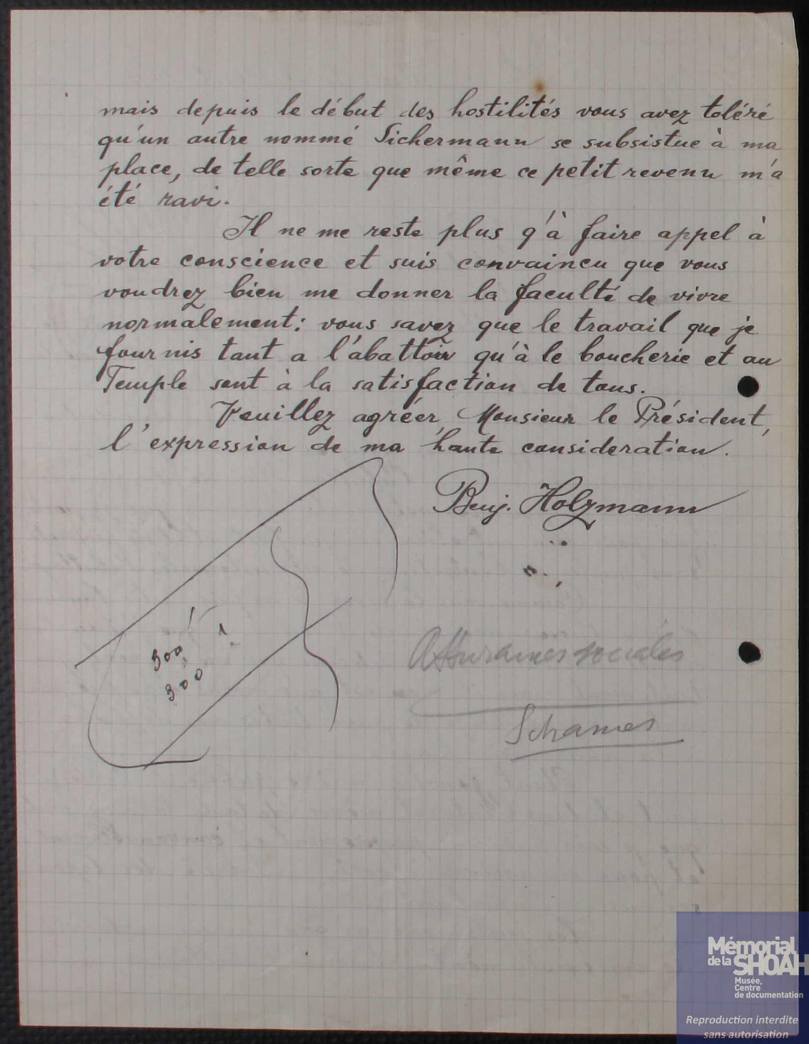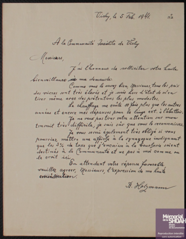 Benjamin Holzmann, d’origine polonaise, s’installe à Vichy à la fin des années 1930. Il réside d’abord au 26 rue de Lisbonne, puis au 79 boulevard de la Salle. Très investi dans la vie communautaire, il exerce comme ministre officiant, veille au respect des règles de la cacherout dans la boucherie Jeux (cf. point correspondant) et officie en tant que sacrificateur.