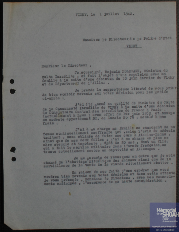 Tous les Juifs étrangers n’étaient pas égaux face à ces mesures. Ceux qui avaient des enfants français, qui étaient malades, qui bénéficiaient d’une protection consulaire ou qui exerçaient une fonction cultuelle ont, dans un premier temps, obtenu un sursis. La communauté israélite, consciente de ces marges de manœuvre, plaide la cause de Benjamin. Dans ses lettres aux autorités, elle insiste sur son statut de fonctionnaire du culte, mais aussi sur sa situation familiale : une épouse malade, des enfants à charge, une mère dépendante. Benjamin obtient l’autorisation de demeurer à Vichy.