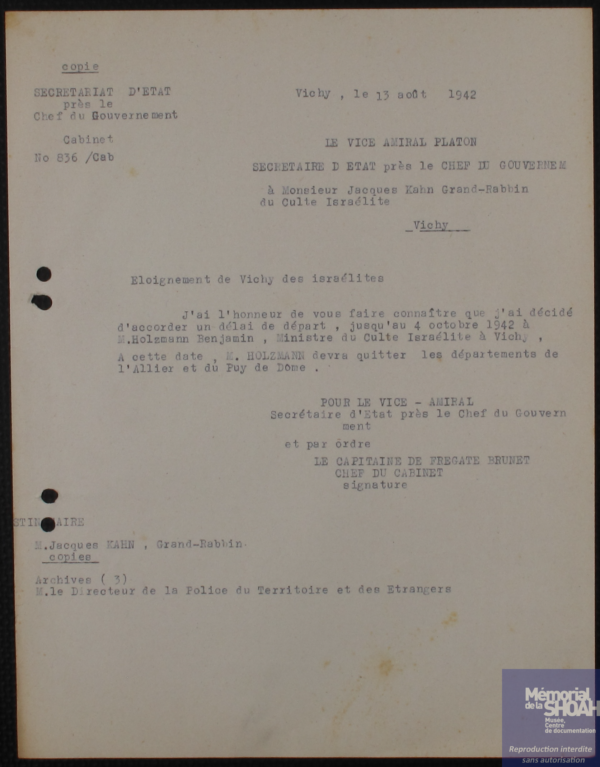 La situation des Juifs à Vichy se dégrade avec l’arrivée du gouvernement en juillet 1940. Devenue capitale du nouvel « État français », Vichy laisse peu de place à ceux que le régime qualifie d’ « indésirables ». Une politique d’éloignement y est mise en œuvre rapidement : les Juifs étrangers en sont les premières cibles. Benjamin reçoit un avis d’expulsion le 19 septembre 1940.
