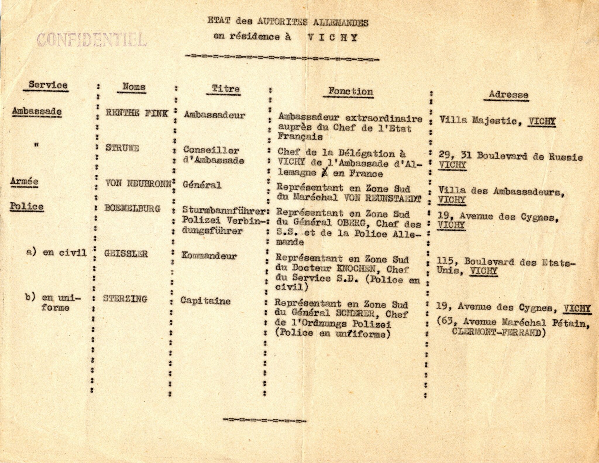 Les premiers représentants du Reich, parmi lesquels le capitaine SS Hugo Geissler, s’installent à Vichy dès 1940, officiellement pour entretenir des relations avec le gouvernement, officieusement pour y mener des missions d’espionnage. À cette époque, leur présence reste discrète et perturbe peu le quotidien des habitants (y compris celui des Juifs). Mais en novembre 1942, avec l’occupation de la zone sud, celle-ci s’intensifie. En 1944, 139 Allemands sont en poste à Vichy.