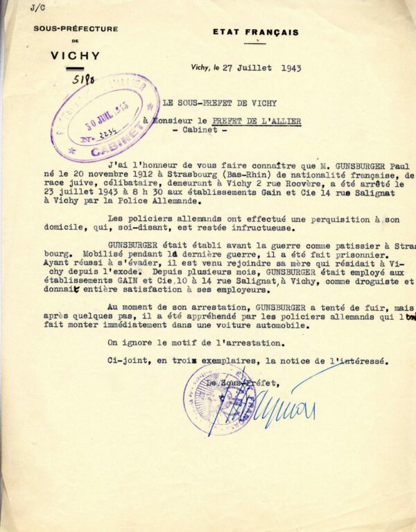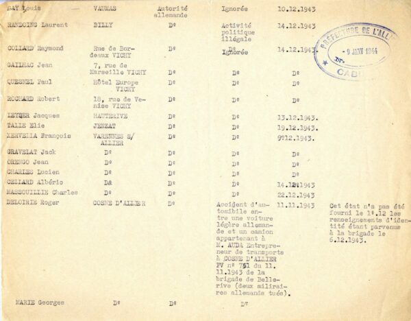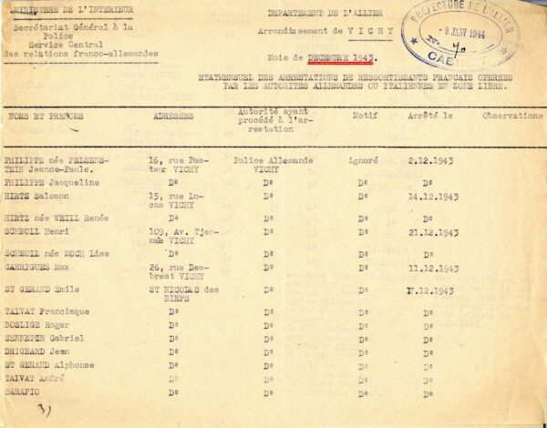 À l’exception de la rafle du 25 février 1943, la majorité des arrestations perpétrées à Vichy en 1943 (environ 50) est le fait des autorités allemandes. Nos connaissances sur ces arrestations demeurent, cependant, fragmentaires. Les seuls documents identifiés à ce jour se résument à des listes policières recensant les individus arrêtés, à quelques échanges entre membres de la communauté juive de Vichy et autorités françaises, ainsi qu’à de rares témoignages.
