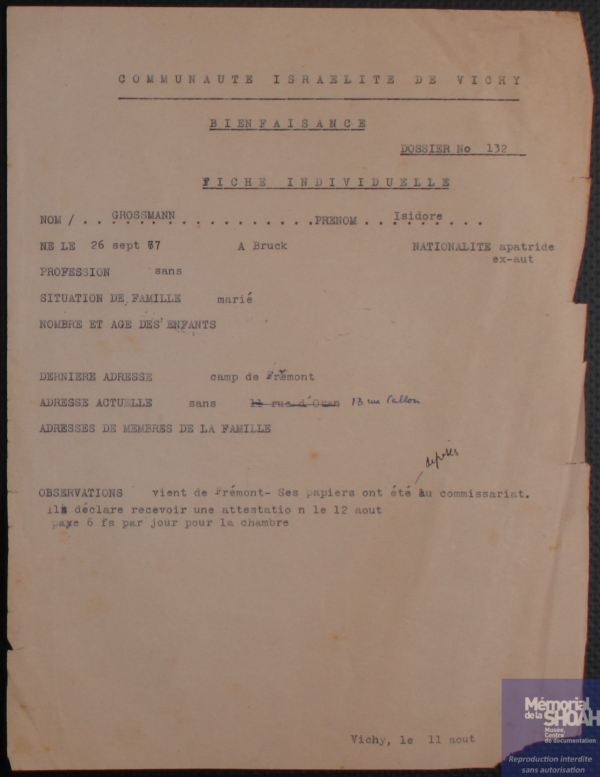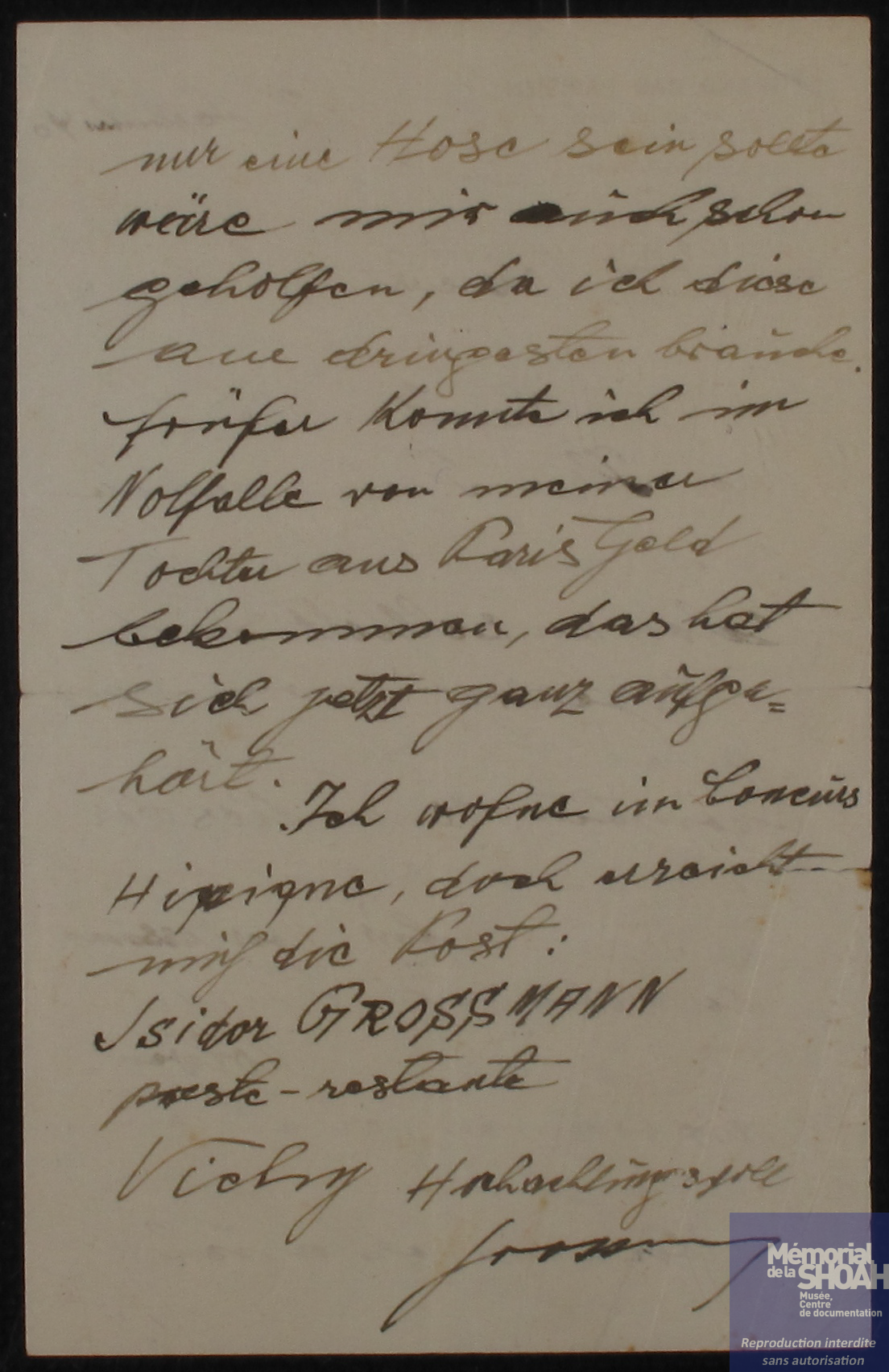 Isidor Grossmann, ressortissant autrichien, arrivé à Vichy en 1940 après un passage par le camp de Frémont, près de Montluçon, fait partie des Juifs candidats à l’émigration. Le parcours d’Isidor à Vichy reste assez flou. Il aurait habité au 13 rue Callou et au 5 place de la Source de l’hôpital, ainsi qu’à d’autres adresses non signalées aux autorités, comme en attestent des lettres envoyées en « poste restante ». Ancien interné, il est probable qu’il ait conservé une grande méfiance à l’égard de l’administration française. Il ne figure par ailleurs sur aucune liste de recensement connue.