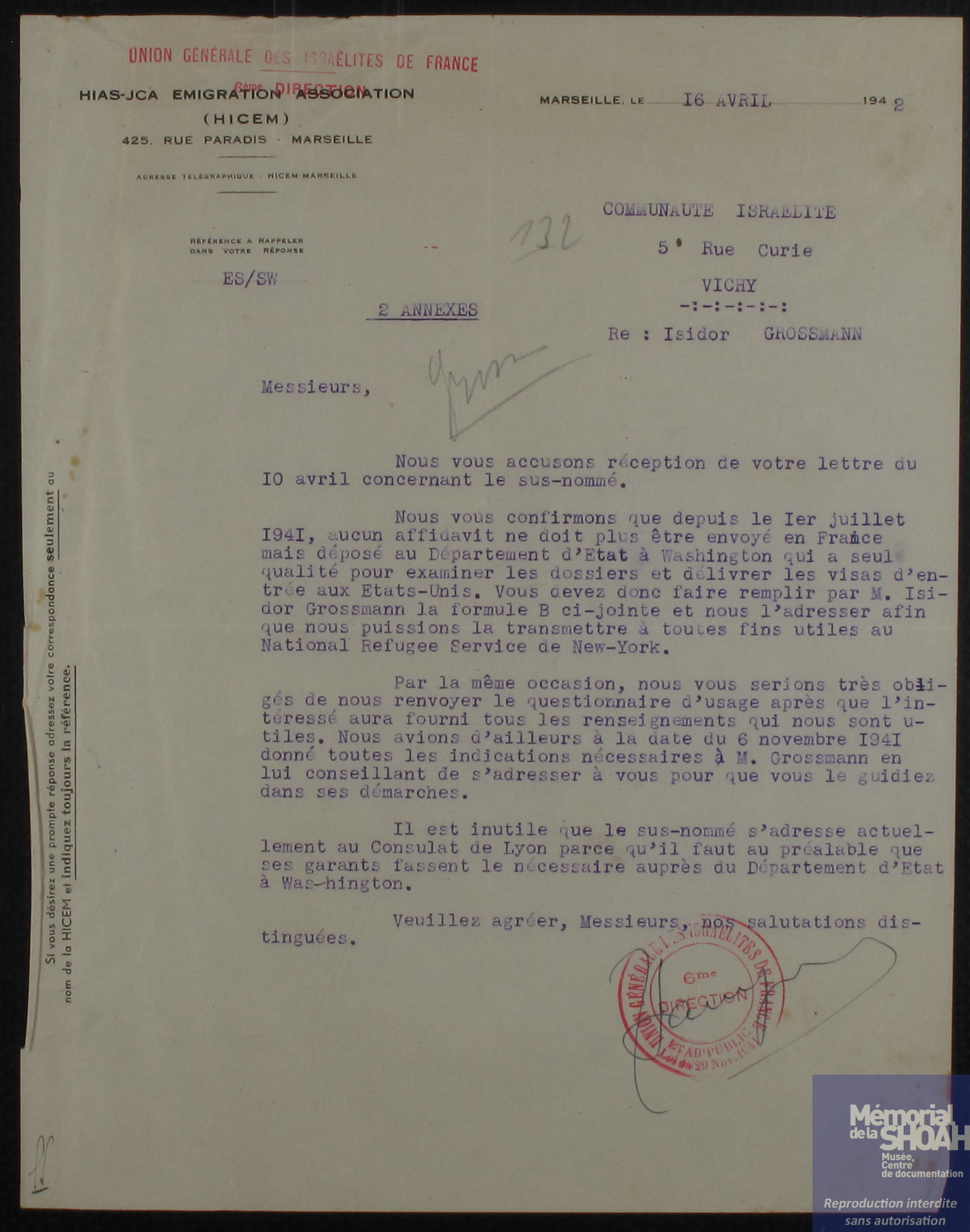Mais après plusieurs mois sans nouvelle des services américains, Isidore commence à s’inquiéter. Il se tourne alors vers le secrétariat de la communauté israélite de Vichy, qui prend contact avec la HICEM, organisation juive internationale, qui aide les Juifs à émigrer. C’est par son intermédiaire qu’Isidor apprend que les règles relatives aux affidavits ont changé depuis le 1er juillet 1941. La HICEM lui fait parvenir un exemplaire du nouveau formulaire à remplir et à renvoyer. Les démarches, toutefois, se révèlent longues et éprouvantes. Isidor n’en viendra malheureusement jamais à bout : il succombe à une crise cardiaque à Vichy le 9 septembre 1942.