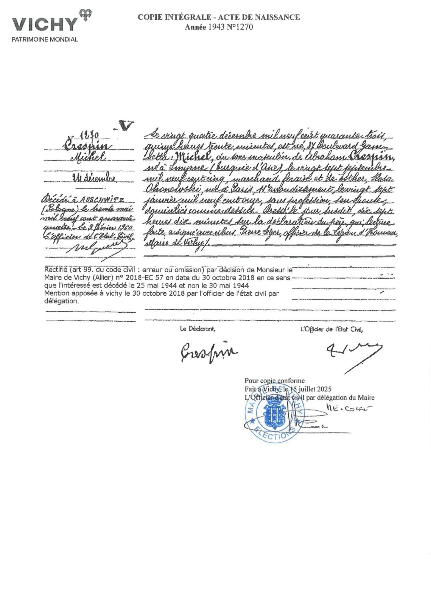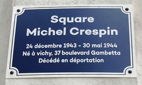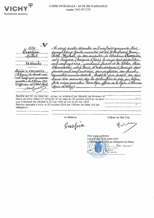 À Vichy, une politique d’éloignement visant tous les Juifs dits « non essentiels » est rapidement mise en œuvre. Des milliers d’entre eux sont ainsi expulsés de la nouvelle capitale. Quelques exceptions sont cependant prévues, notamment en faveur des Juifs vichyssois, établis dans la ville avant la guerre. Bien qu’Albert soit de nationalité étrangère, lui, Esther et Golda sont autorisés à rester. Pour autant, détenir un permis de séjour en règle ne constitue nullement une garantie d’immunité. La famille Crespin n’échappe pas aux mesures discriminatoires instaurées par le second Statut des Juifs et par l’ensemble des textes qui en découlent. Le 10 janvier 1942, un arrêté signé par Xavier Vallat, commissaire général aux Questions juives, place le commerce de frivolités d’Albert sous le contrôle d’un administrateur provisoire. Malgré ces épreuves, la vie continue au domicile des Crespin. Le 24 décembre 1943, Esther donne naissance à leur fils, Michel.
