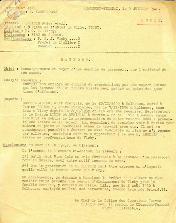 Devenue capitale du nouvel « État français », Vichy offre peu de place aux Juifs. Une politique d’éloignement y est mise en œuvre rapidement : les Juifs étrangers en sont les premières cibles. Les familles françaises, à l’instar de la famille Ebstein, sont, dans un premier temps, épargnées par ces mesures. Mais lorsqu’au début de l’année 1941 l’exclusion s’étend aux Juifs français, l’angoisse saisit l’ensemble de la communauté. Seront-ils, eux aussi, expulsés ? Et qu’en sera-t-il des réfugiés venus des territoires interdits, dont beaucoup appartiennent à de vieilles familles françaises et bénéficient du statut d’expulsés ?