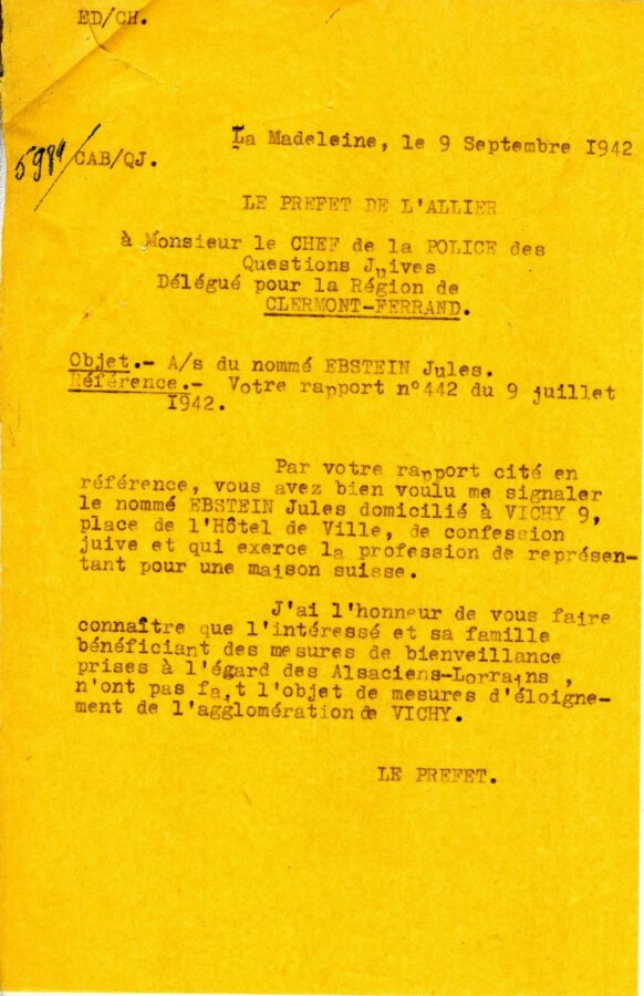 Dans une note du 28 juin 1941, Henry Chavin précise qu’aucune autorisation de séjour à Vichy ne doit être accordée aux réfugiés juifs originaires d’Alsace-Lorraine et de la zone interdite. En pratique, toutefois, les dossiers des Juifs français issus de ces régions sont souvent traités avec une certaine bienveillance. Ainsi, en 1942, lorsque la police aux questions juives réclame l’expulsion de la famille Ebstein, au motif que la présence de Jules à Vichy n’est pas « essentielle », le préfet s’y oppose. Cette indulgence à l’égard des réfugiés de l’Est demeure, cependant, relative : entre 1941 et 1943, plusieurs centaines d’entre eux sont expulsés.