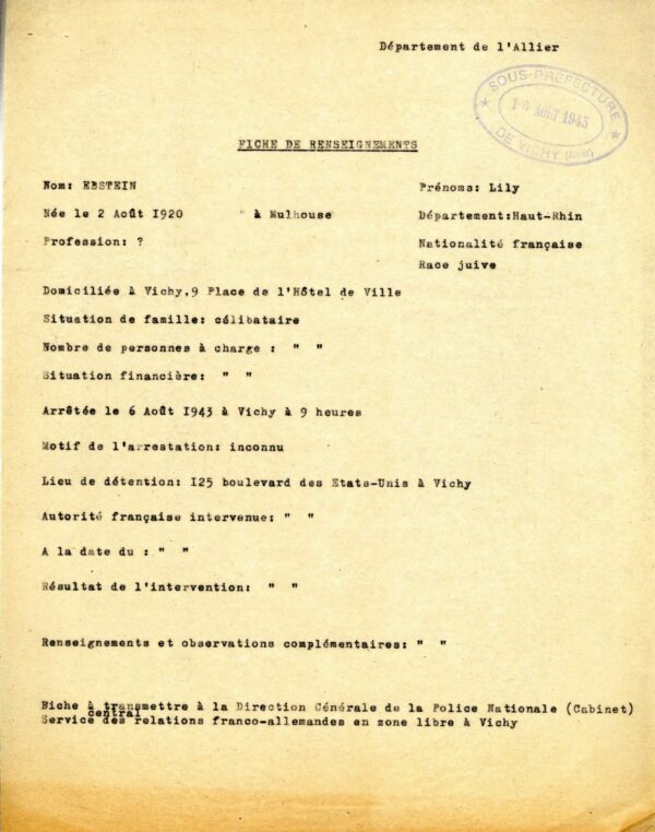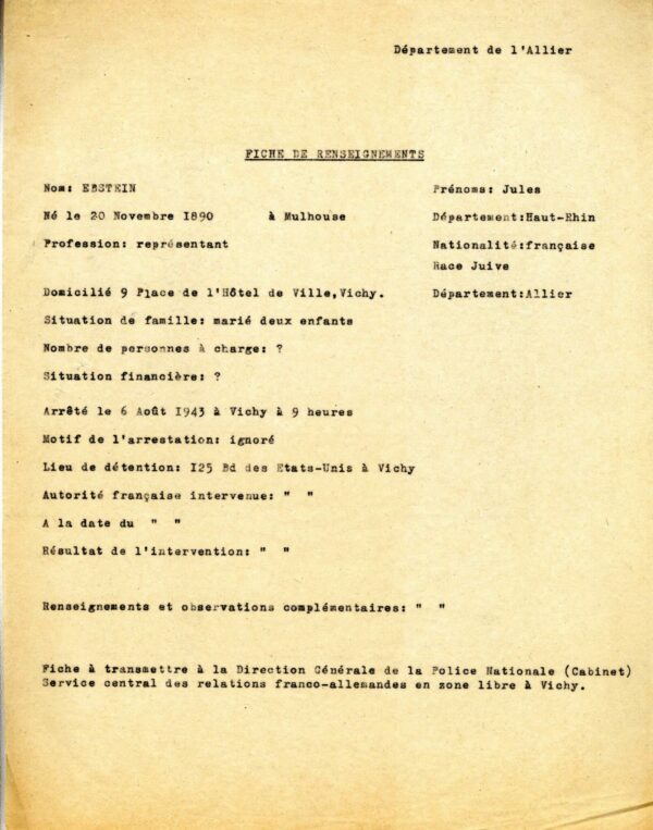 Dénoncée par un collègue de Jules, toute la famille Ebstein est arrêtée en août 1943. Les parents sont appréhendés à leur domicile, tandis que les enfants sont interpellés sur leur lieu de travail (Lily, 23 ans, est secrétaire ; Raymond, 21 ans, employé dans un magasin d’alimentation). Tous les quatre sont internés à la prison de la Mal Coiffée à Moulins, puis transférés à Drancy avant d’être déportés à Auschwitz par le convoi 60. Aucun n’a survécu.