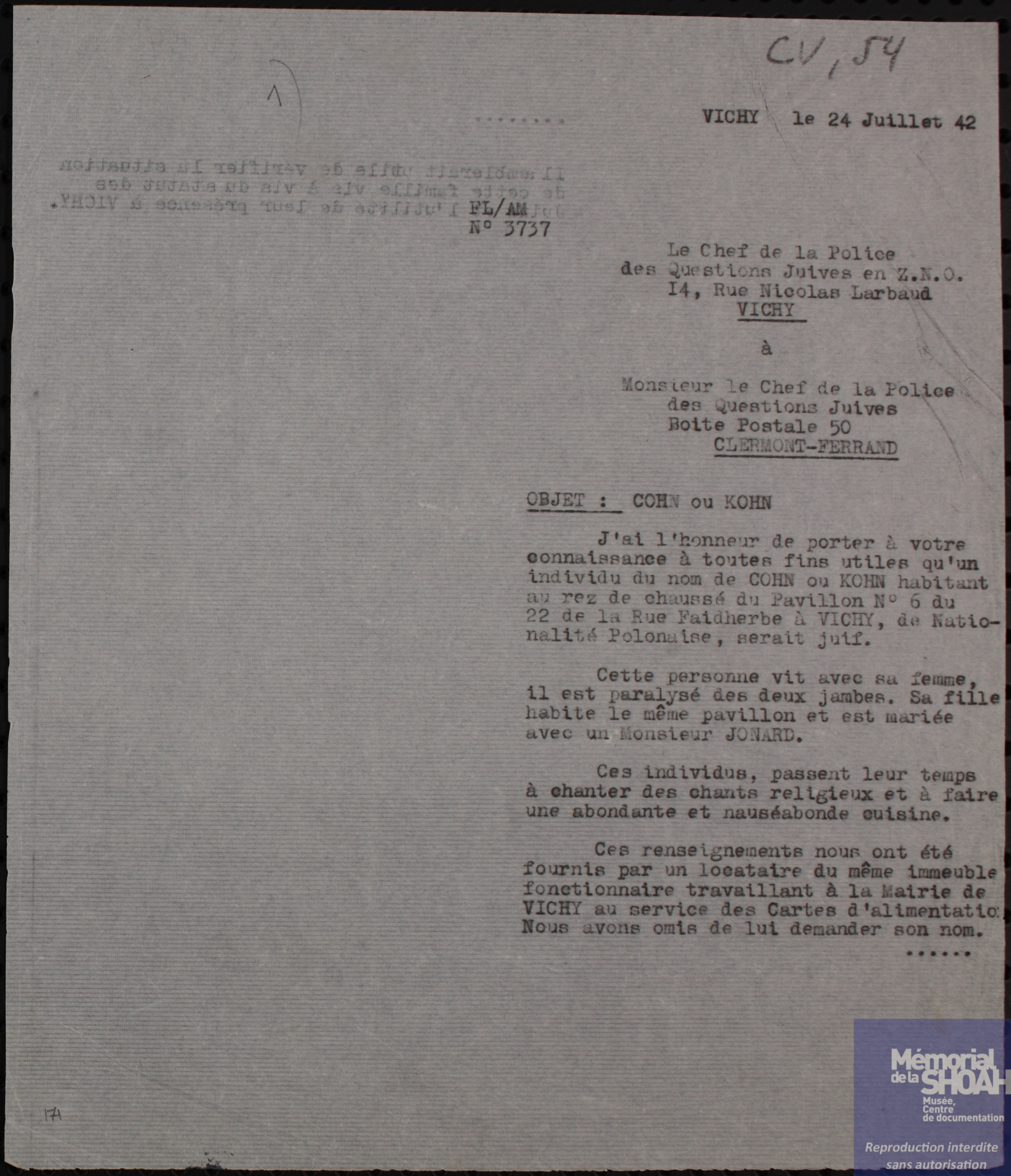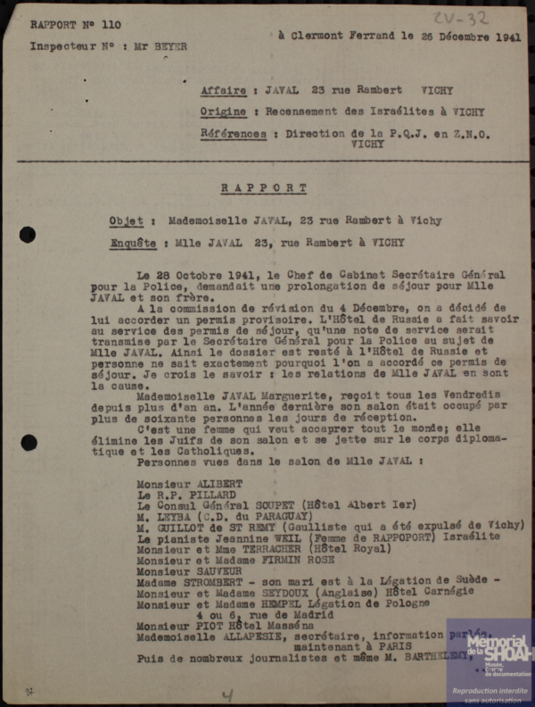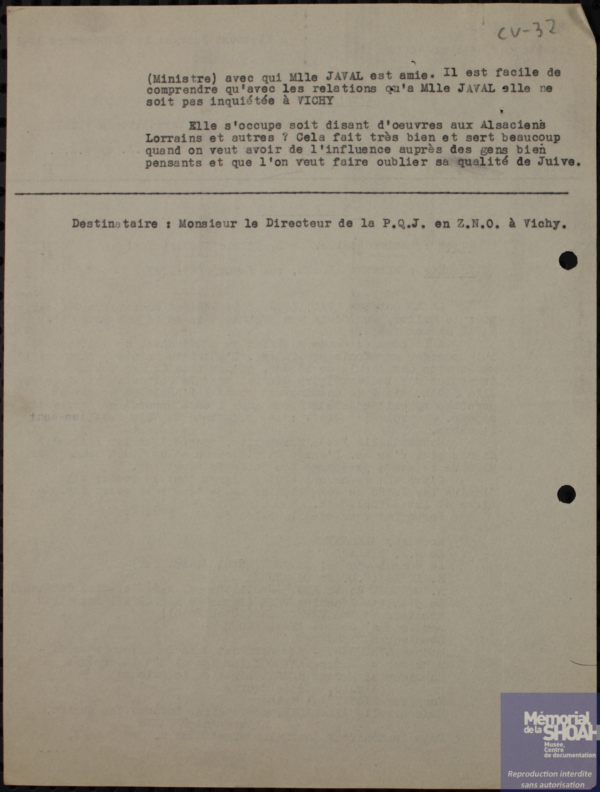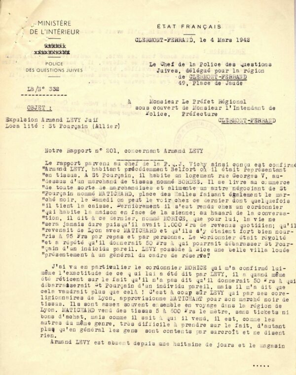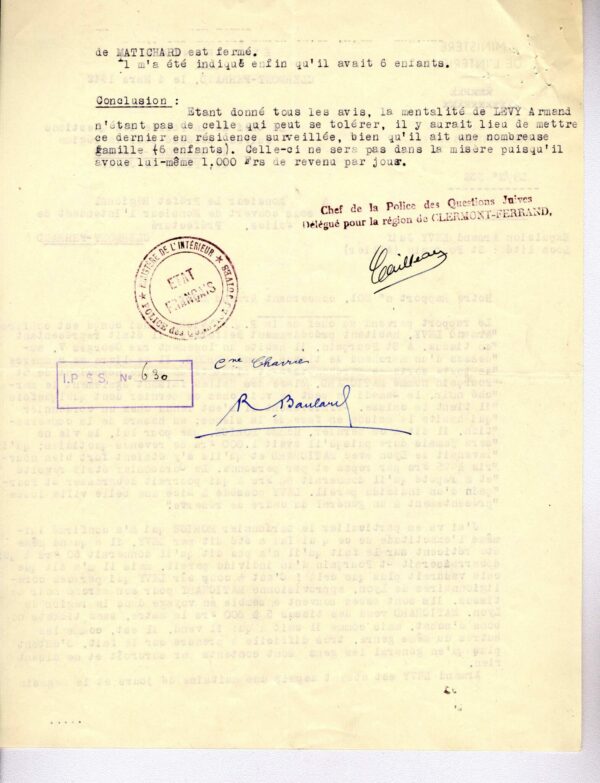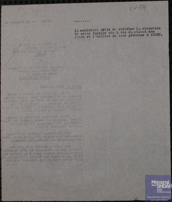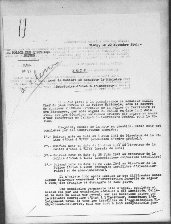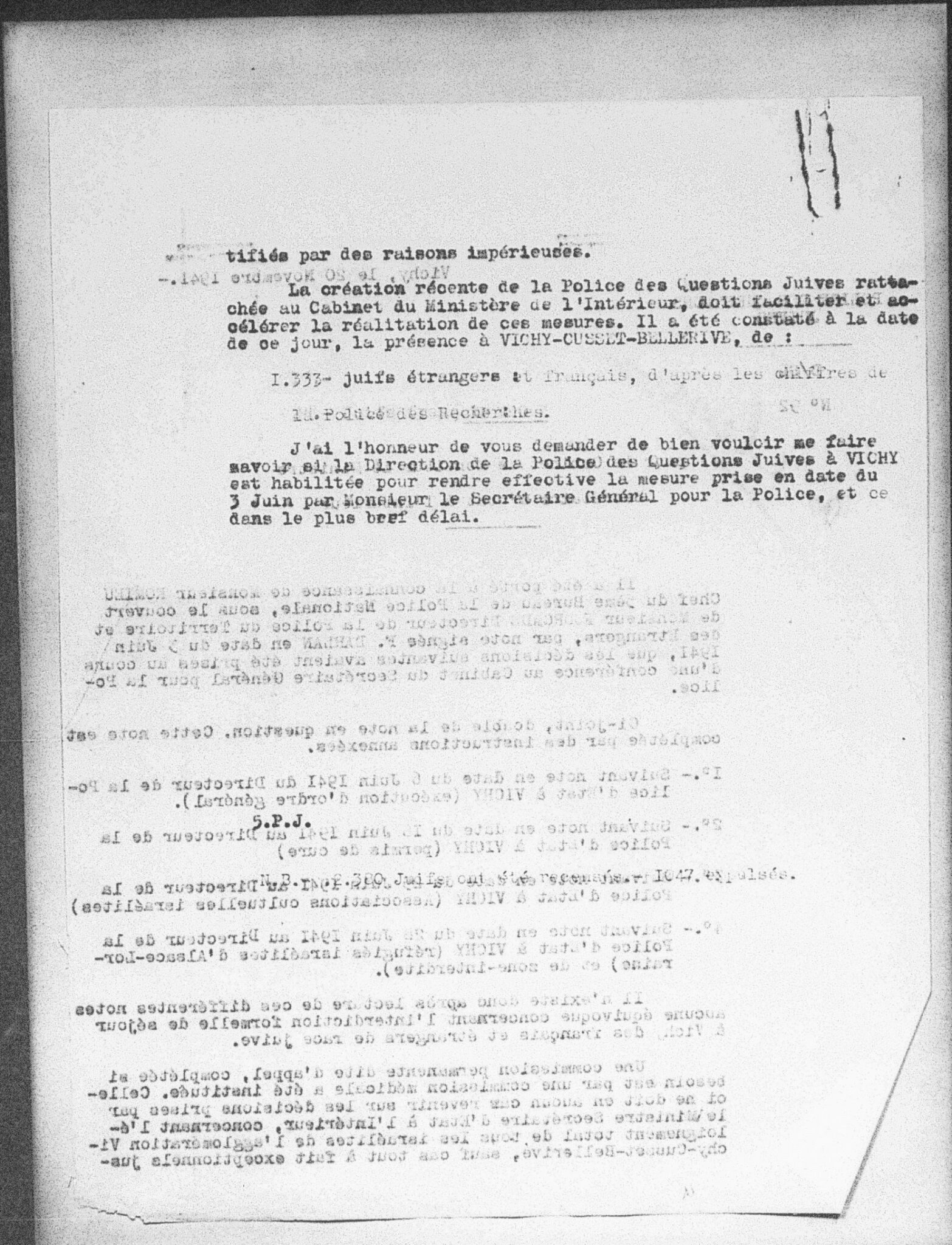 À Vichy, le travail des inspecteurs de la PQJ (sur le statut des Juifs notamment) donne du grain à moudre au CGQJ, qui multiplie les recommandations, voire les injonctions, à plusieurs administrations, dont la Police, chargée de l’exécution des ordres d’éloignement.