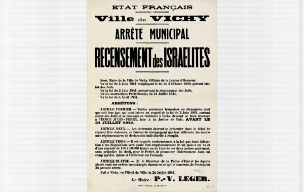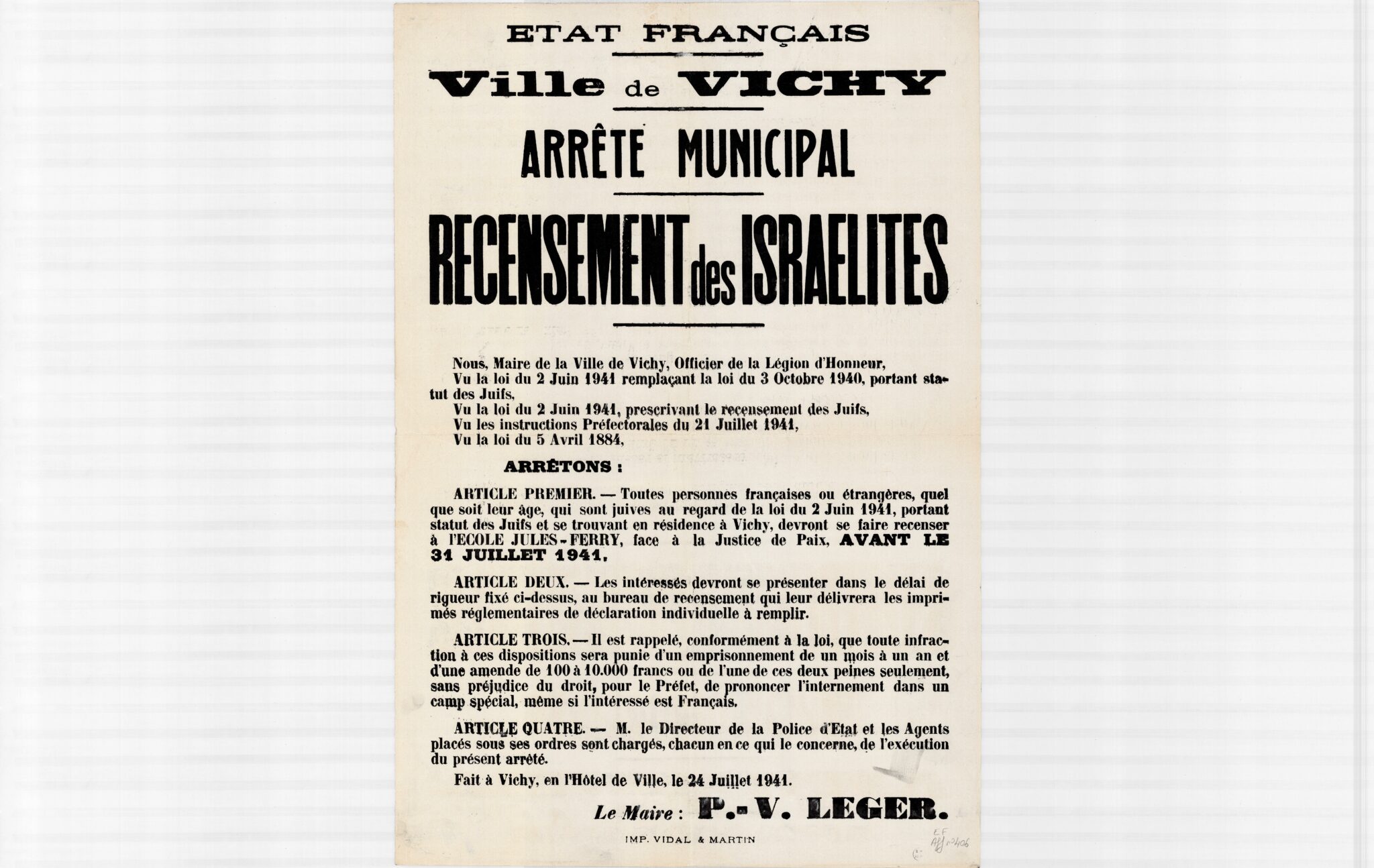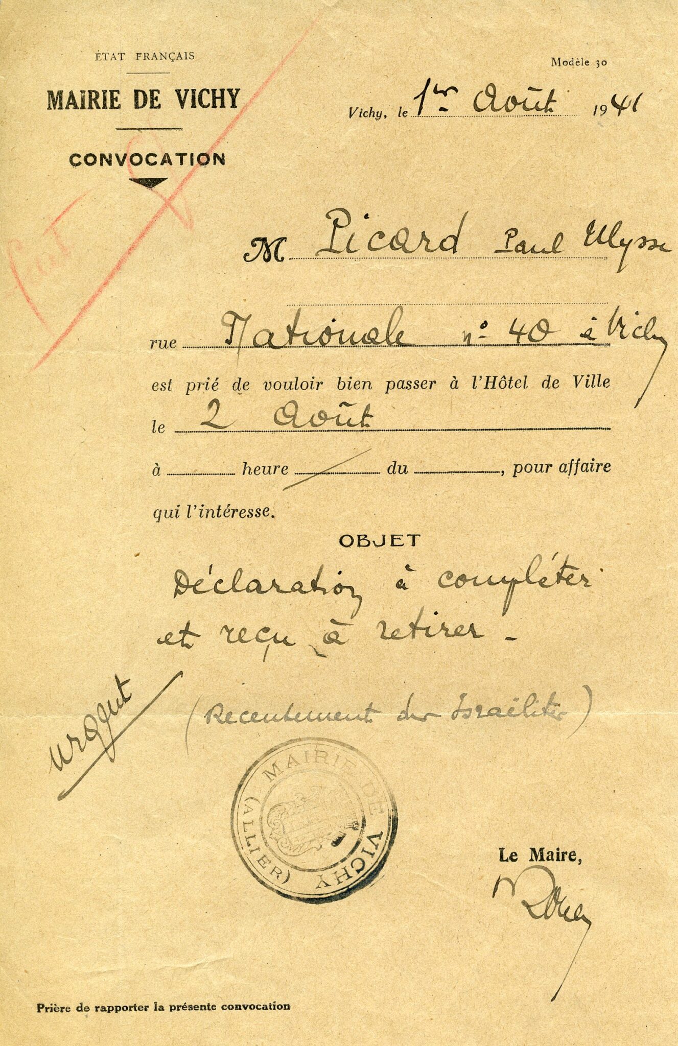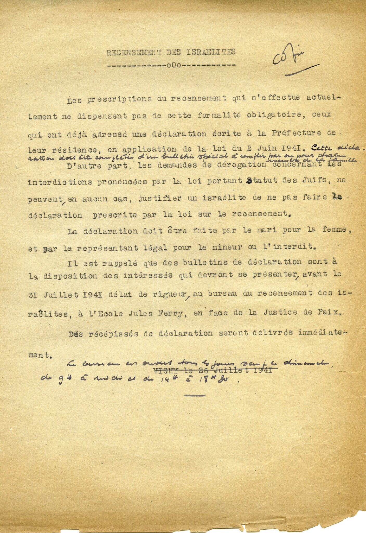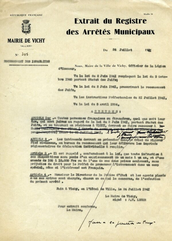 À Vichy, le maire, Pierre-Victor Léger, s’exécute. Trois versions de l’arrêté municipal prescrivant le recensement sont nécessaires avant d’aboutir à une version définitive, le choix du lieu du bureau ayant donné lieu à quelques tergiversations. Dans le premier projet, non publié, il est indiqué que les Juifs « devront se faire recenser à la Mairie, Bureau de la Taxe de Séjour ». Dans une seconde version, on demande aux Juifs de se présenter dans « la salle municipale des fêtes, entrée de service, sur le côté du poste des sapeurs-pompiers », avant de décider que l’école Jules Ferry, inoccupée pendant les vacances scolaires, est plus appropriée. Les Juifs peuvent s’y présenter du lundi au samedi de 9 heures à midi et de 14 heures à 18h30. À chaque dépôt du formulaire réglementaire, des récépissés de déclaration sont délivrés. Ces documents servent de preuve de la soumission correcte du formulaire et sont essentiels pour toute démarche administrative future.