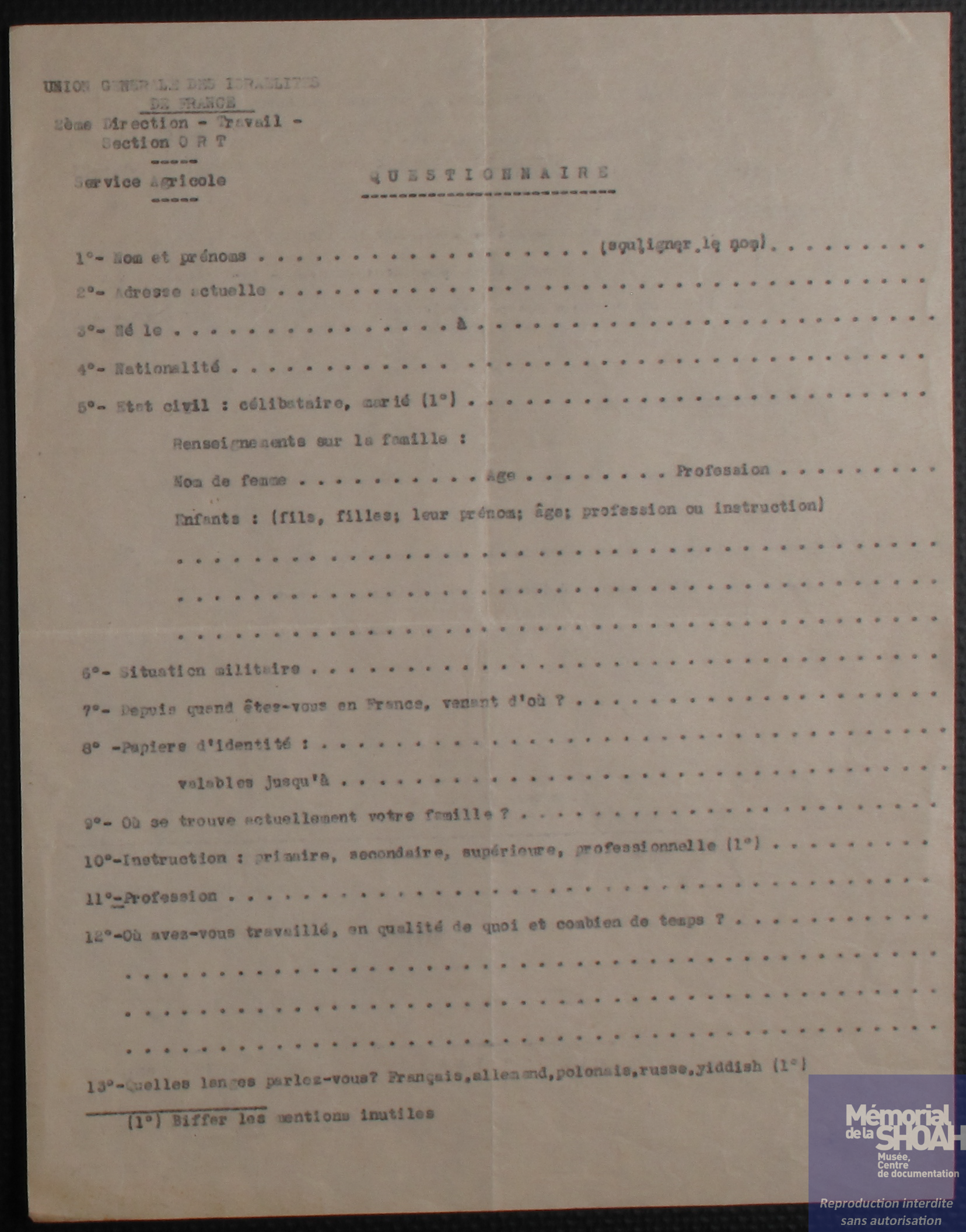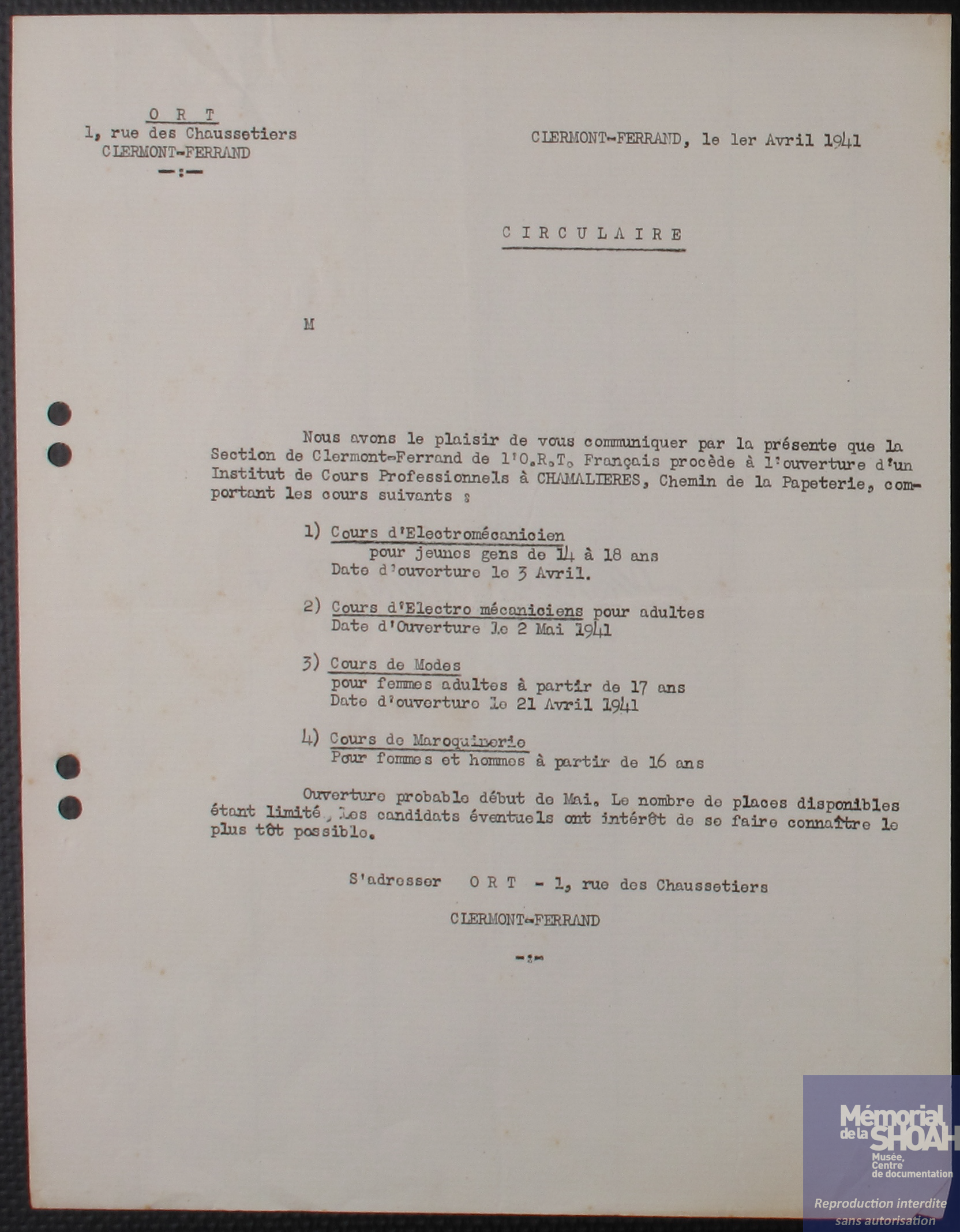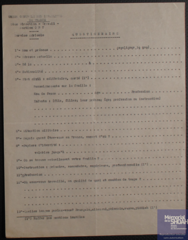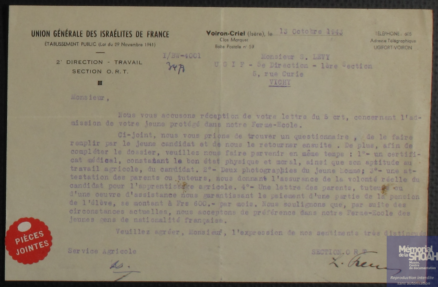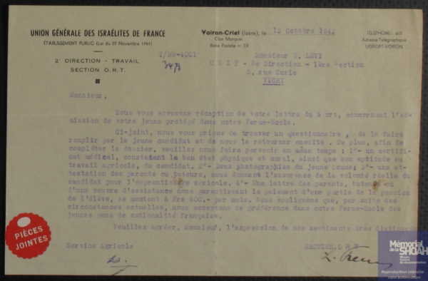 L’intégration de l’ORT à l’UGIF ne bouleverse en rien son fonctionnement. Mais l’aggravation de la condition des Juifs en France détourne peu à peu l’attention de ses bénéficiaires potentiels. Des places sont disponibles dans beaucoup d’exploitations agricoles et de fermes écoles. L’ORT demande aux sections locales de relayer l’information. À Vichy, Salomon Hirtz, le président de la communauté israélite, fait circuler des renseignements sur les possibilités de formations dans le Lot-et-Garonne.