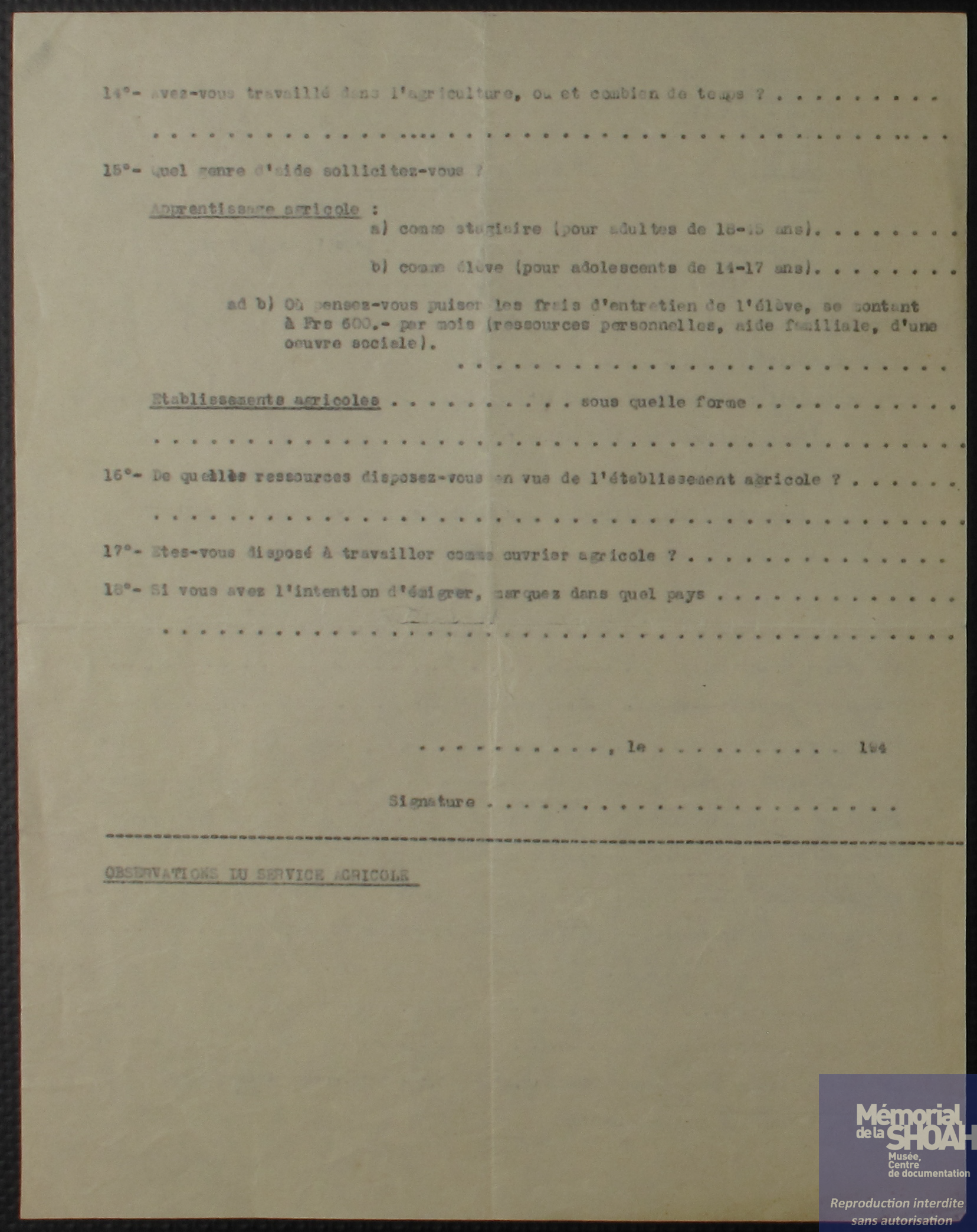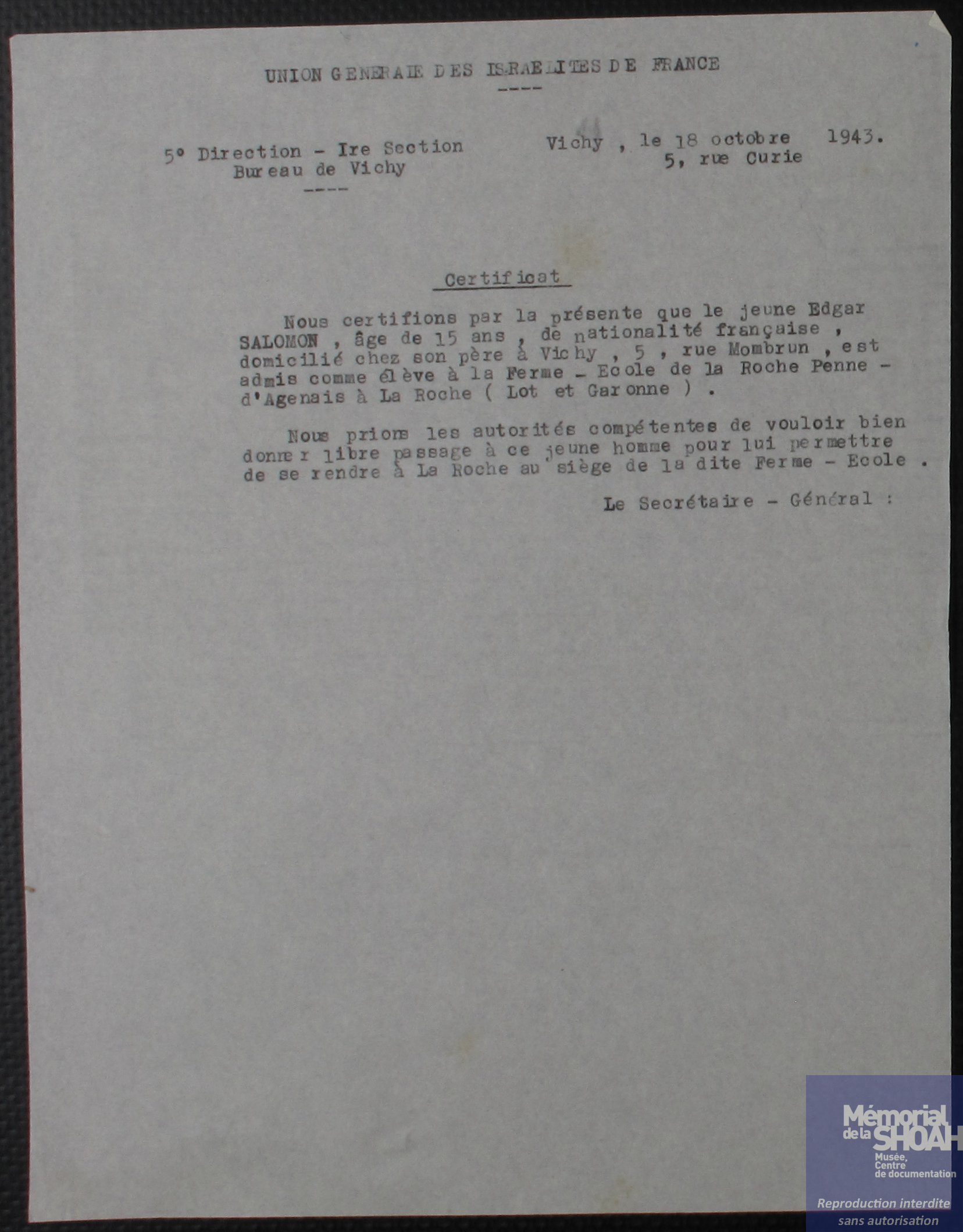 La famille d’Edgar Salomon, domiciliée au 5 rue Mombrun, y voit une opportunité intéressante. En octobre 1943, Edgar est admis à la ferme école de la Roche Penne, installée sur un domaine de 40 hectares dans le Lot-et-Garonne. Ouverte en fin d’année 1942, elle accueille des garçons de 14 à 17 ans pour une durée de deux ans, à l’issue desquelles les élèves sont « en état d’assurer leur existence par le travail de la terre ». L’ORT transmet au secrétariat de la communauté juive, chargée de relayer auprès des Salomon, la liste des pièces justificatives à fournir. Peut-être découragés par la complexité administrative de l’inscription ou dans l’incapacité de s’acquitter des frais de pension, Edgar et sa famille renoncent finalement, expliquant qu’ils préfèrent « attendre encore un petit moment ».