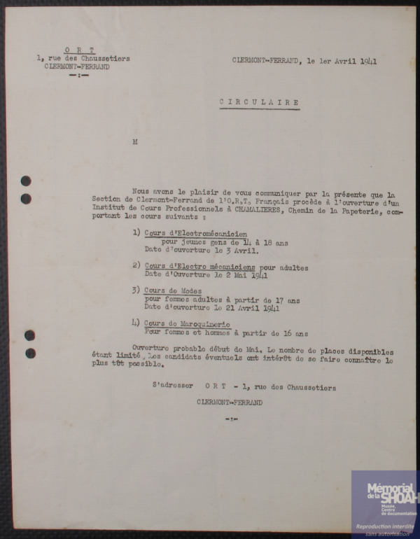 L’Organisation pour la Reconstruction par le Travail (ORT) est une organisation juive internationale créée pour promouvoir le travail artisanal, industriel et agricole parmi les Juifs. Présente en France depuis les années 1920, l’ORT est implantée sur tout le territoire. Pendant la guerre, son siège social est à Marseille mais elle possède des bureaux locaux dans de nombreuses villes, y compris à Vichy, où elle partage un bureau avec l’Œuvre de Secours aux Enfants (OSE) au 11 rue Carnot (hôtel Charmel). L’ORT bénéficie du soutien du grand rabbin de France, qui voit dans cette initiative une manière pragmatique de réorienter les Juifs vers les métiers manuels, une nécessité imposée par les circonstances.